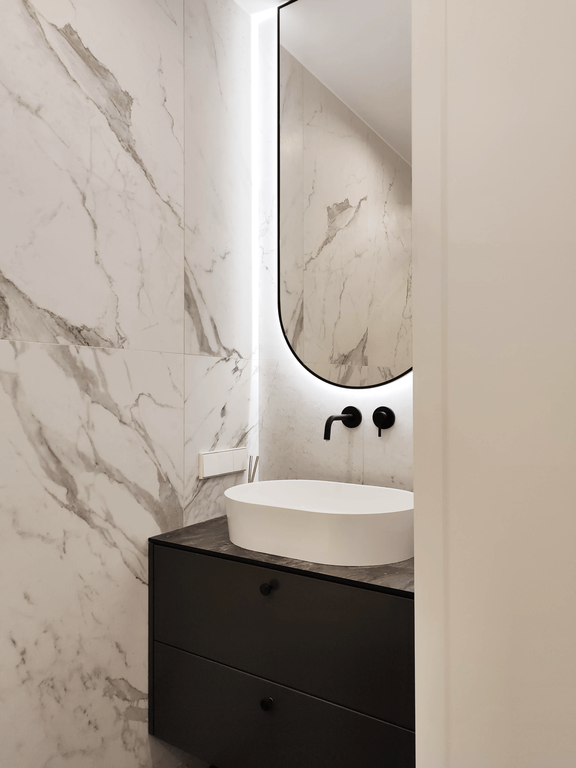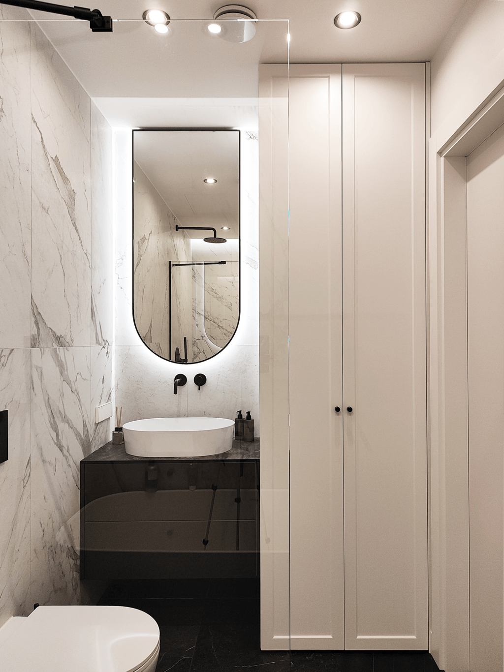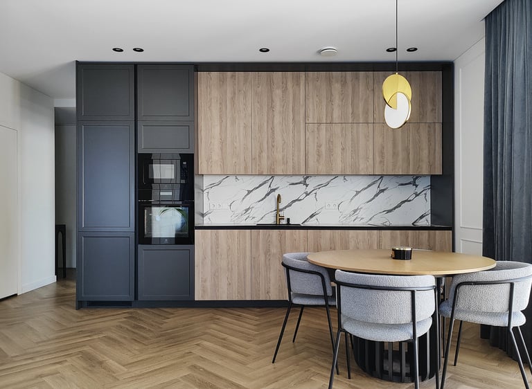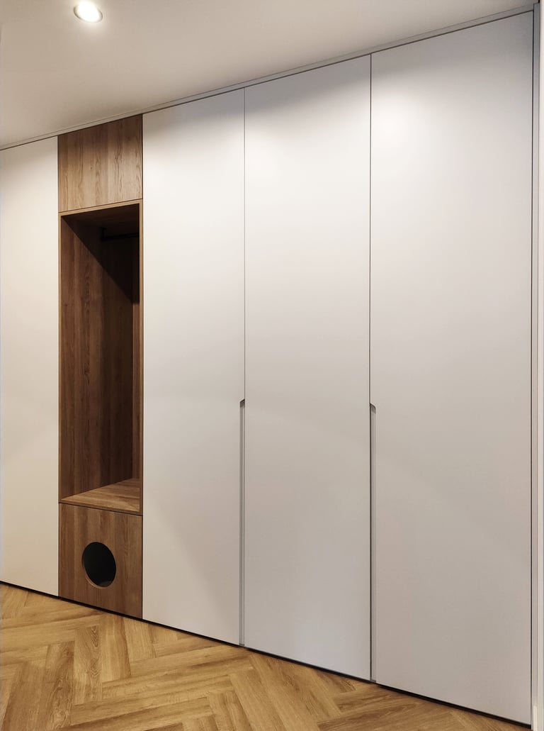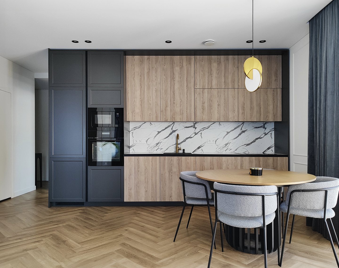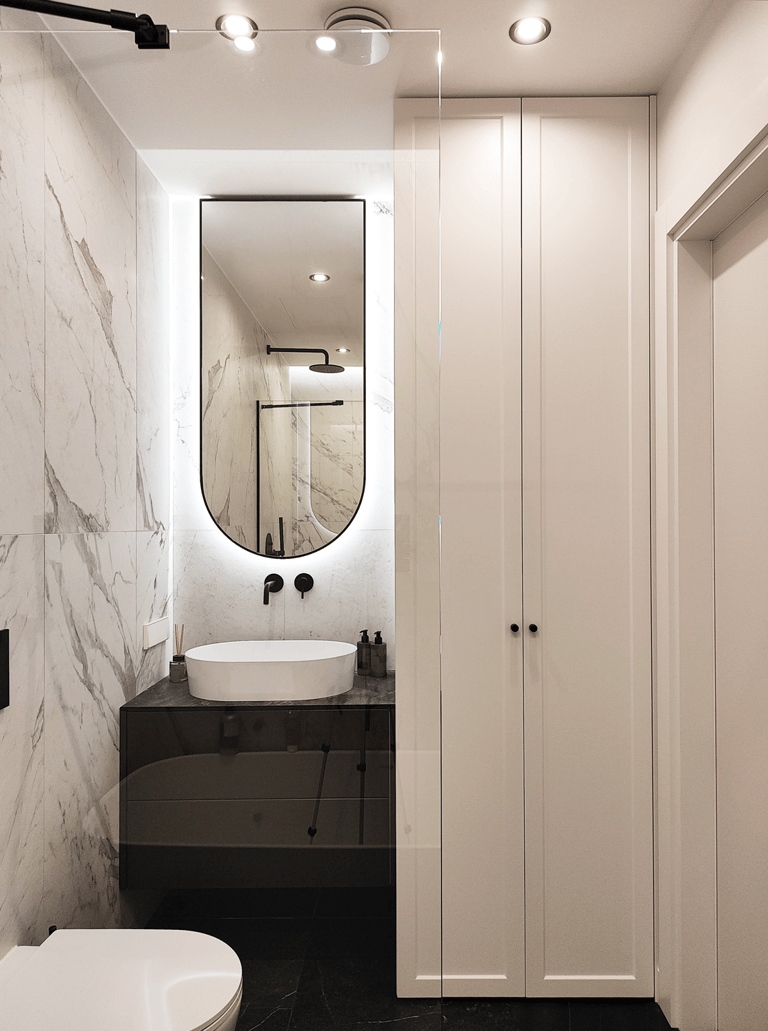 Įgyvendintas viso buto projektas, nuo koridoriaus iki virtuvės, nuo vonios iki miegamojo. Išraiškingos formos, suderintos faktūros, bei tekstūros.