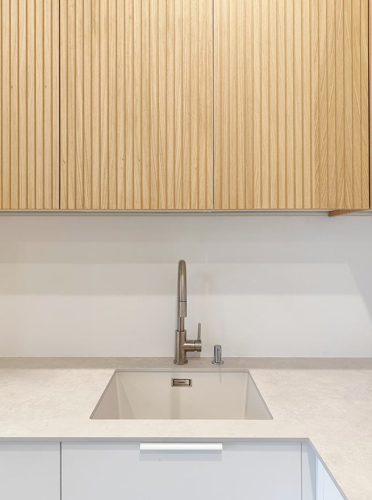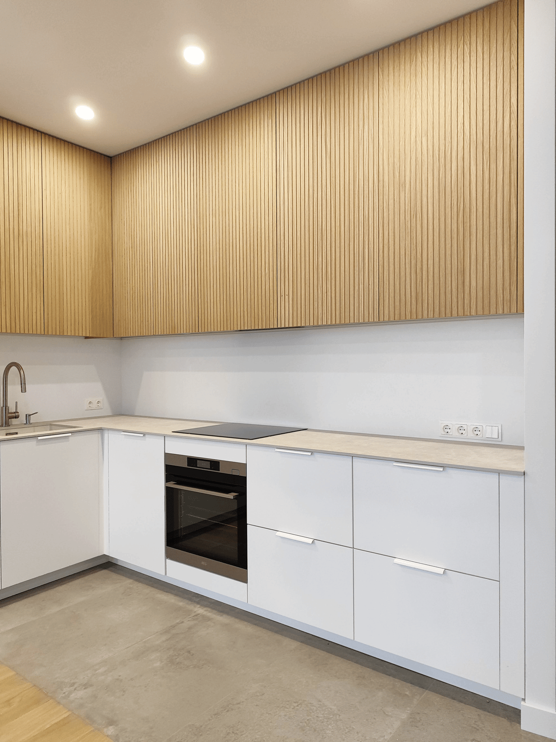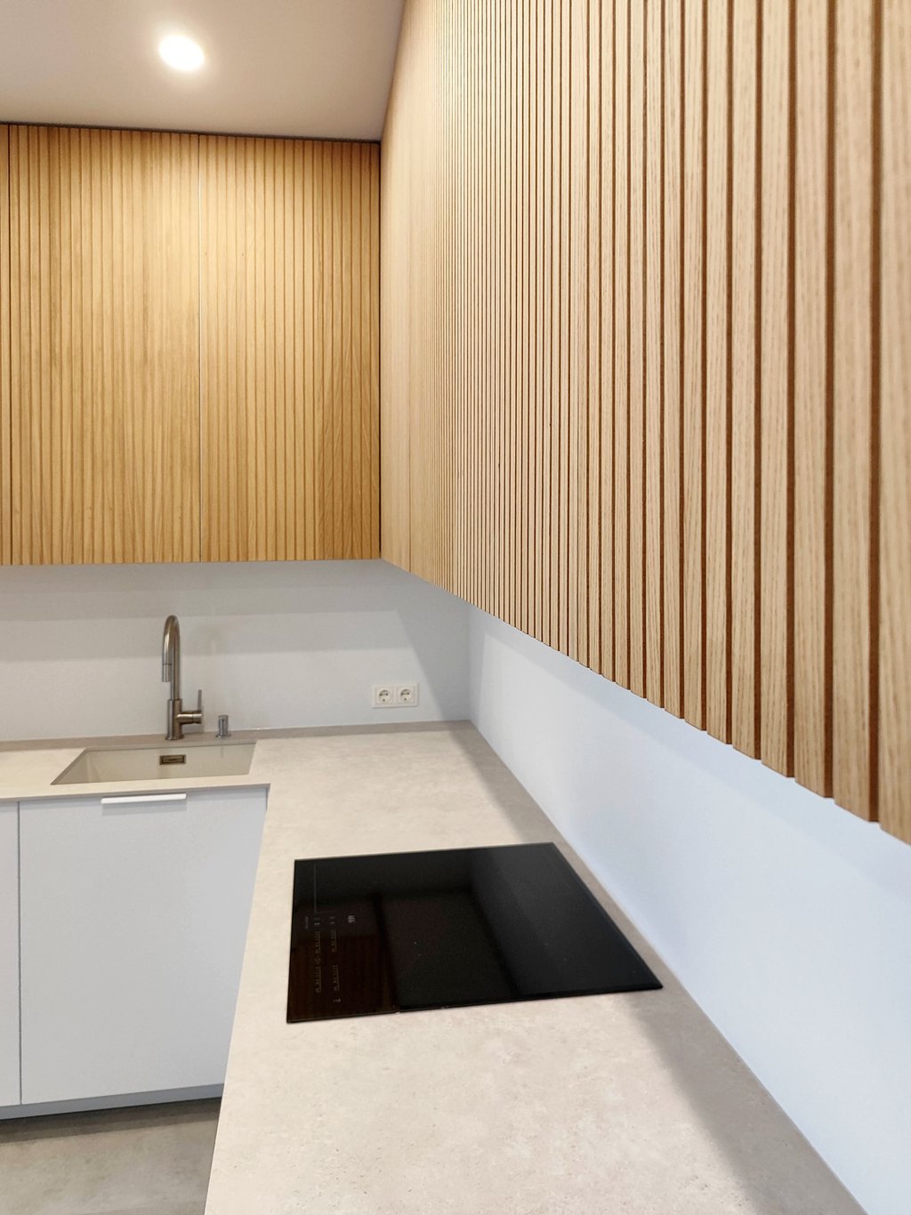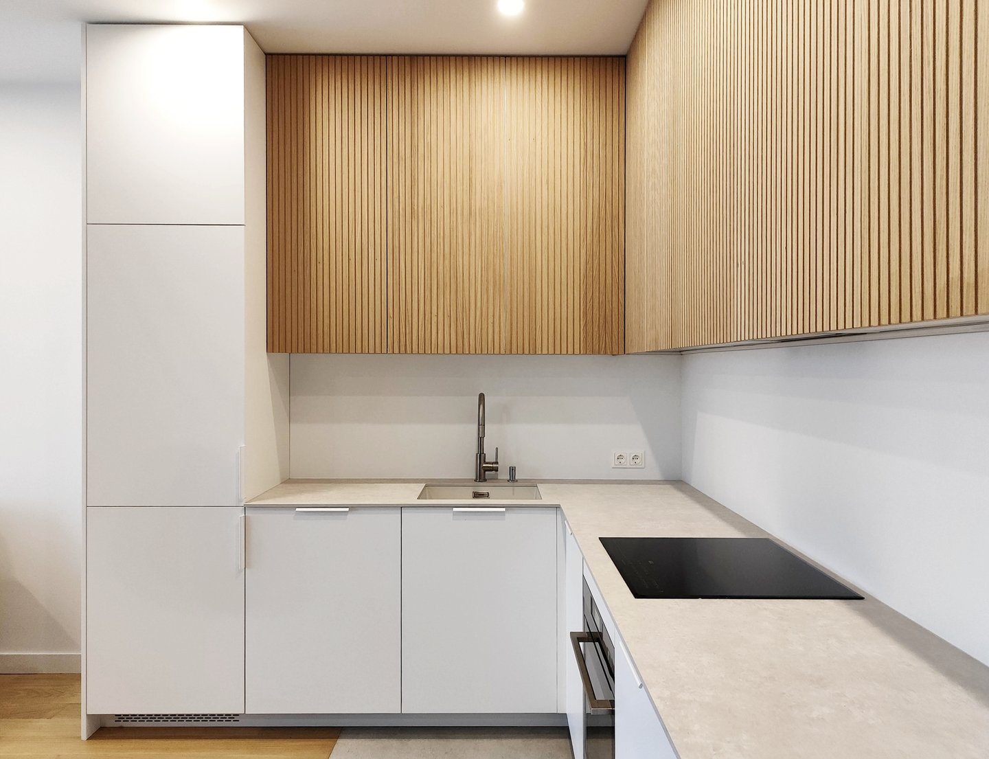 Jauki ir šviesi virtuvė su natūralios spalvos fasadais.
