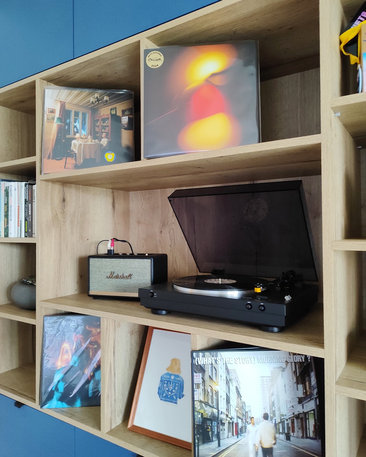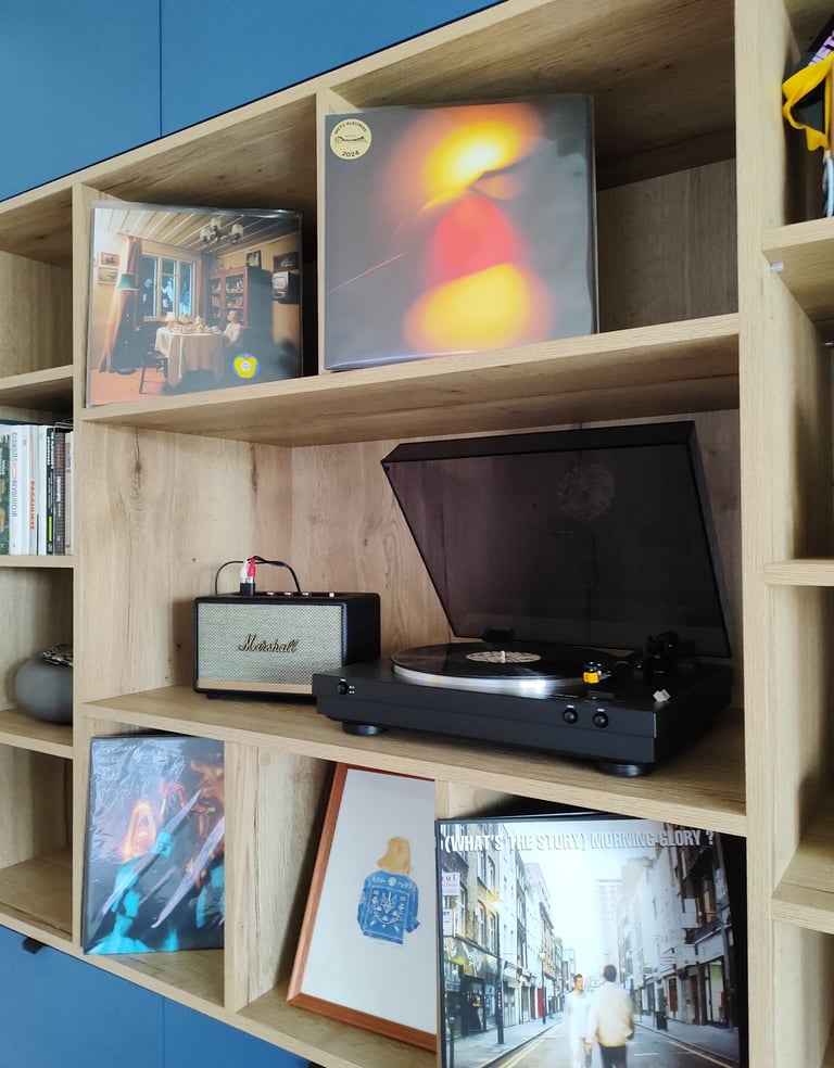 Moderni sieninė spinta su natūralaus ąžuolo ir matinės mėlynos spalvos deriniu. Viršutinėje dalyje – uždari skyriai su paslėptomis rankenėlėmis, viduryje – atviros lentynos, idealiai tinkančios knygoms ar interjero detalėms eksponuoti. Apatinėje dalyje – talpūs stalčiai, užtikrinantys tvarką ir funkcionalumą. Švarių linijų dizainas ir spalvų kontrastas kuria ryškų, bet elegantišką, šiuolaikišką interjero akcentą.