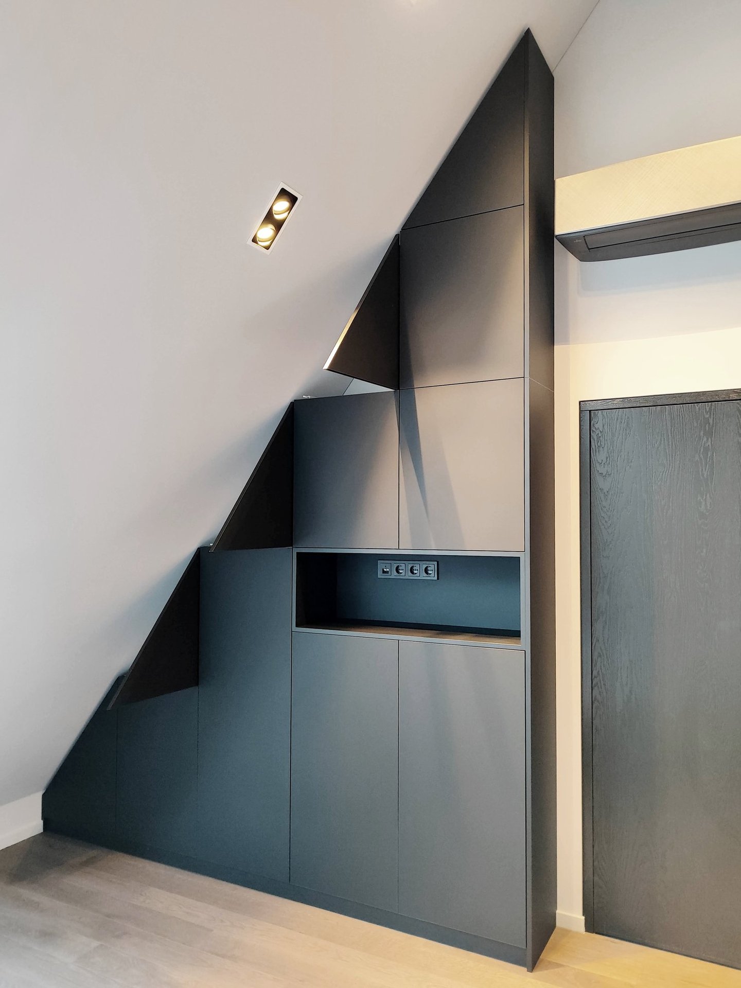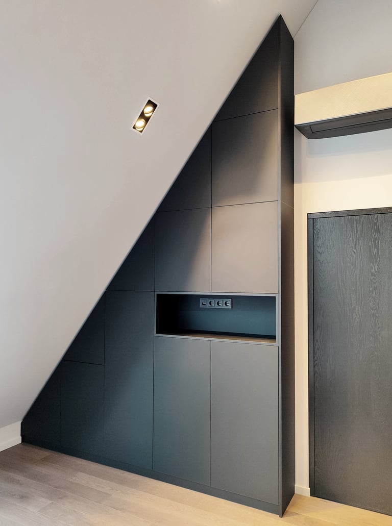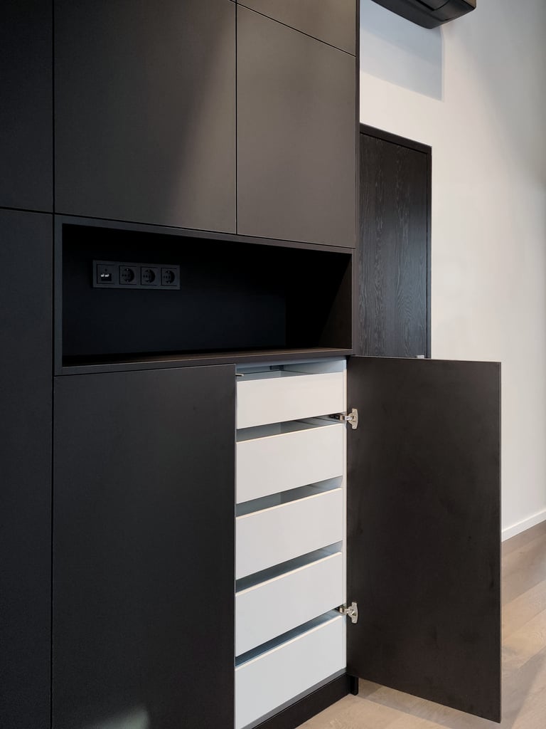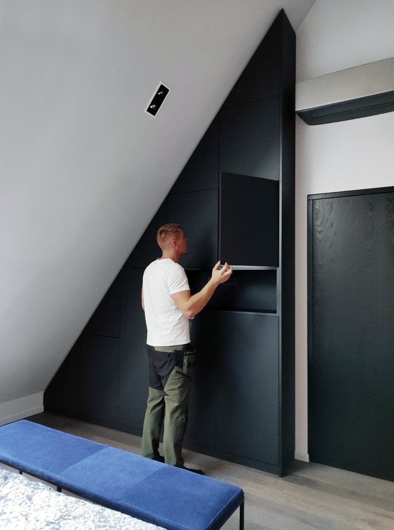 Unikali, išsirtinio dizaino ir formos miegamojo spinta. Puikiai išnaudojome plotą daiktų laikymui, nes kiekviena spintos dalis tapo spintelėmis. Taip pat buvo integruoti švelnaus uždarymo ir pilno ištraukimo stalčiai.