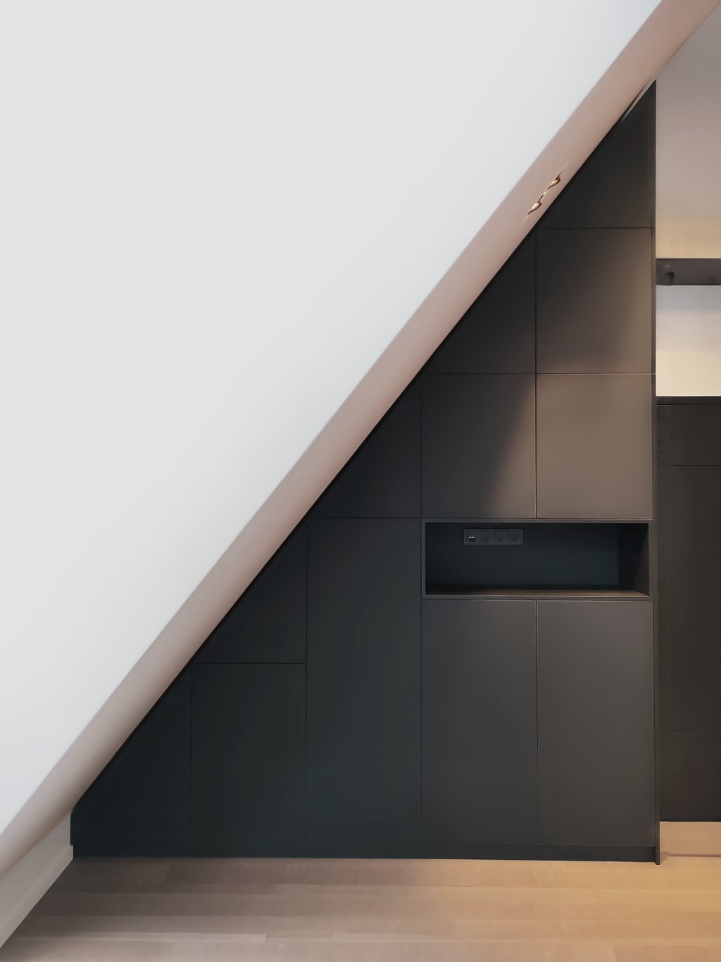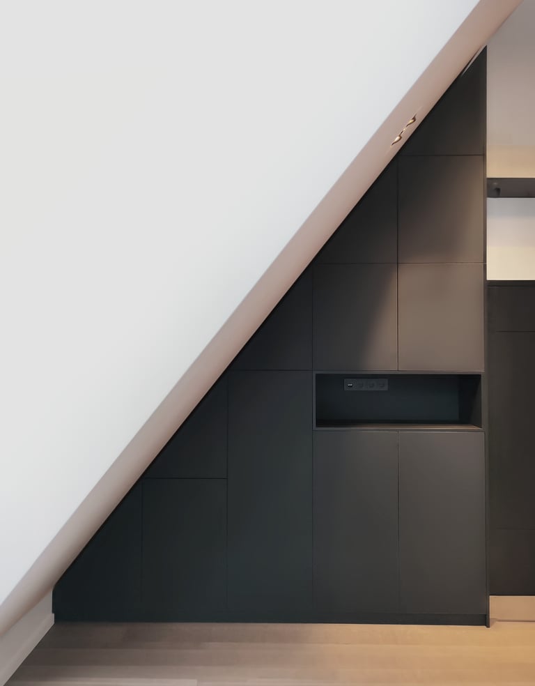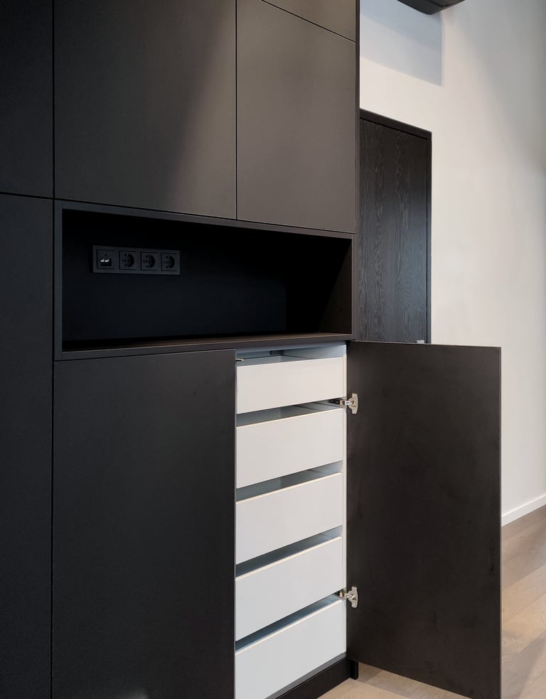 Unikali, išsirtinio dizaino ir formos miegamojo spinta. Puikiai išnaudojome plotą daiktų laikymui, nes kiekviena spintos dalis tapo spintelėmis. Taip pat buvo integruoti švelnaus uždarymo ir pilno ištraukimo stalčiai.