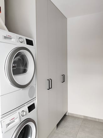 Projektuojant šią ūkinę spintą, turėjome atsižvelgti į visus šios patalpos įrenginius ir norą juos paslėpti. Kruopščiai išmatavę ir apgalvoję, suprojektavome bei pagaminome spintą, kurioje pasislėpė rekuperatorius, dulkių siurblys robotas, paskirstymo skydas, rozetės, o taip pat liko daug vietos patogiam sandėliavimui.