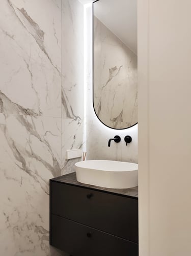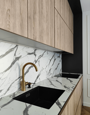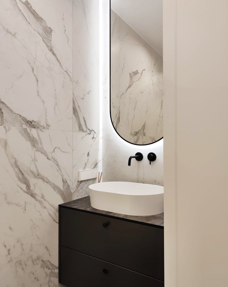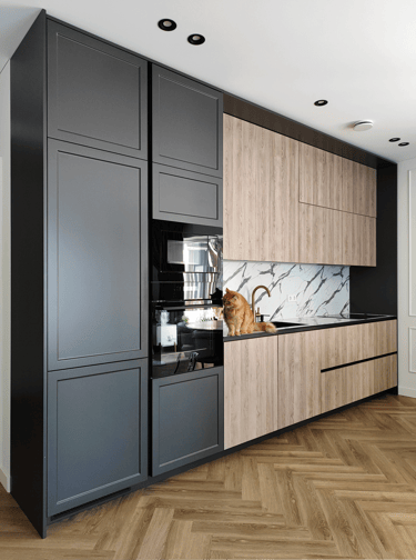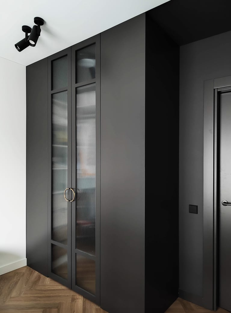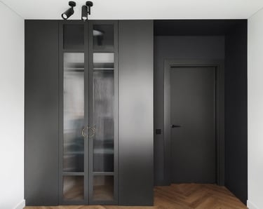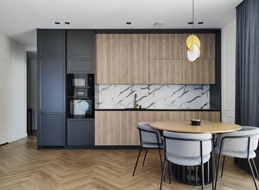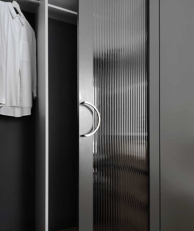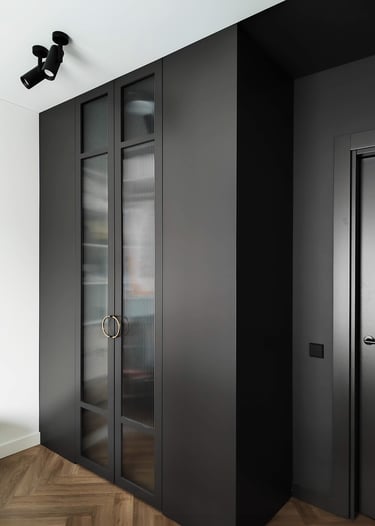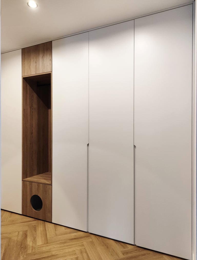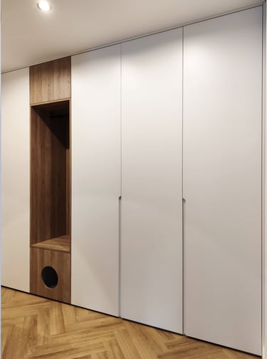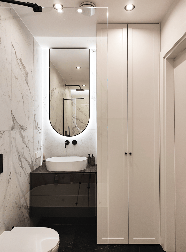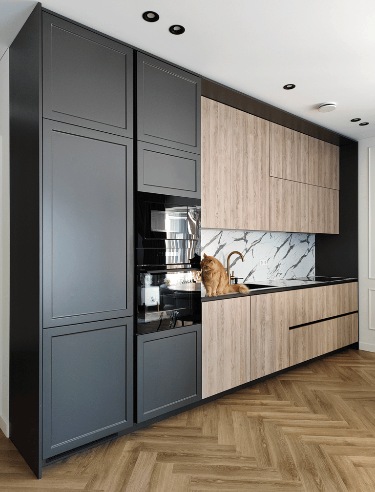 Įgyvendintas viso buto projektas, nuo koridoriaus iki virtuvės, nuo vonios iki miegamojo. Išraiškingos formos, suderintos faktūros, bei tekstūros.