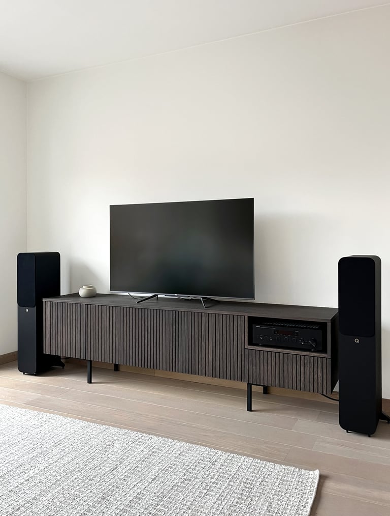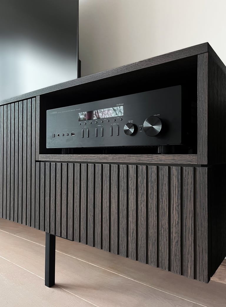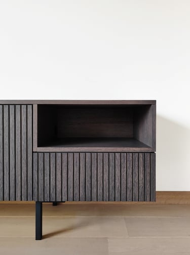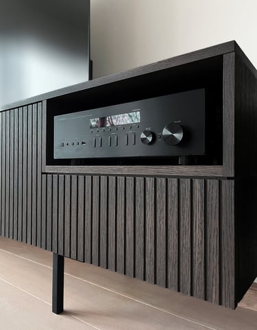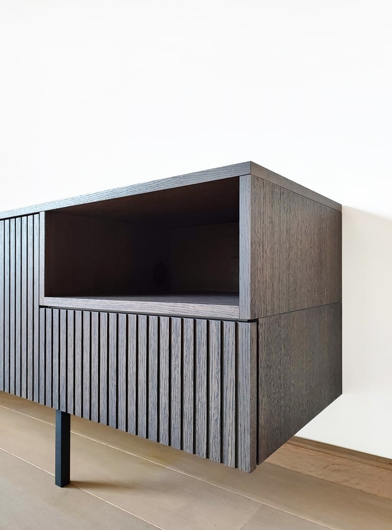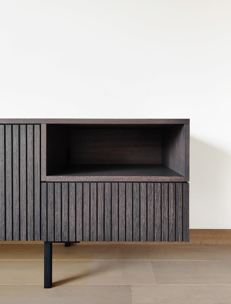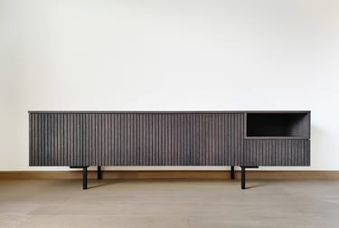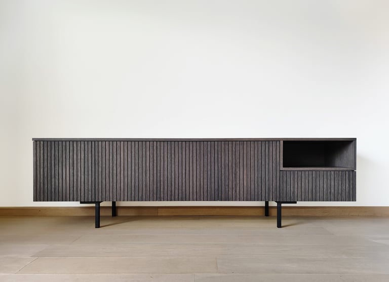 Unikalus, pagal užsakymą kurtas baldas.Laisvai pastatomas tv staliukas-komoda gali puikiai talpinti visus jūsų įrenginius ir atrodyti stilingai.