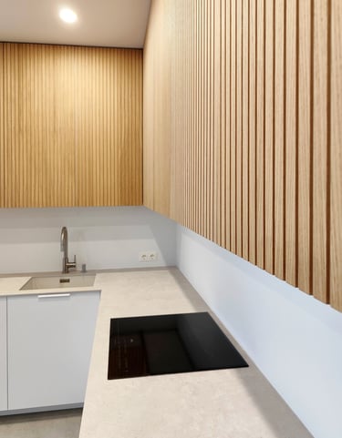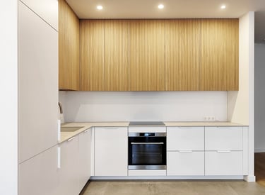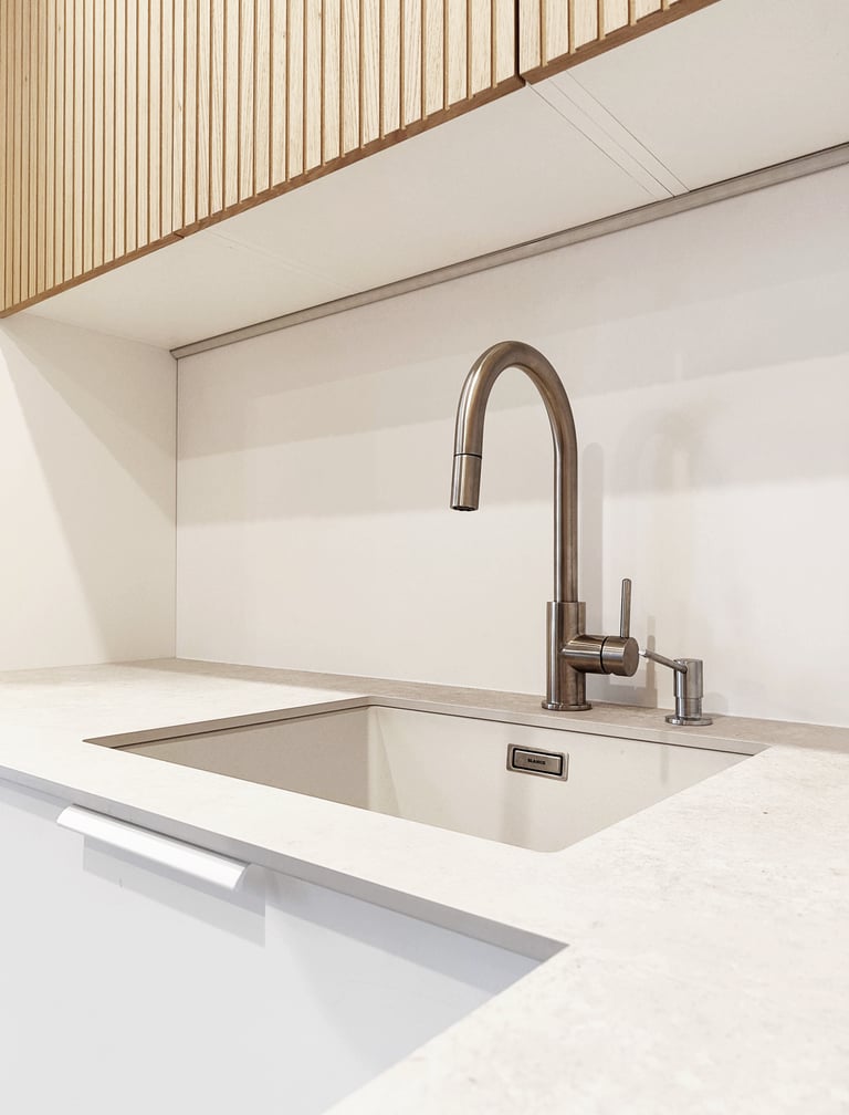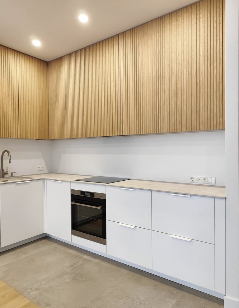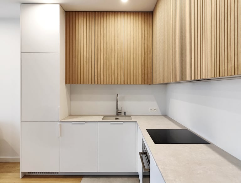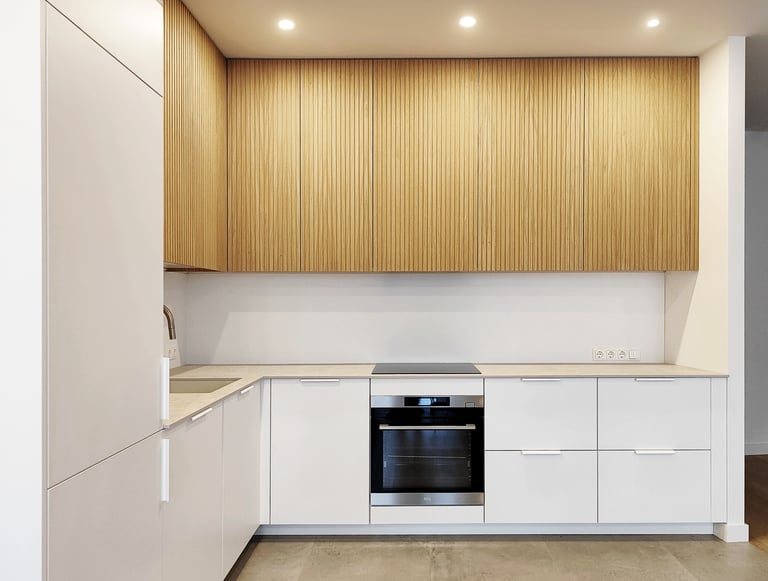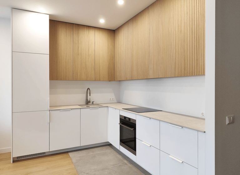 Jauki ir šviesi virtuvė su natūralios spalvos fasadais.