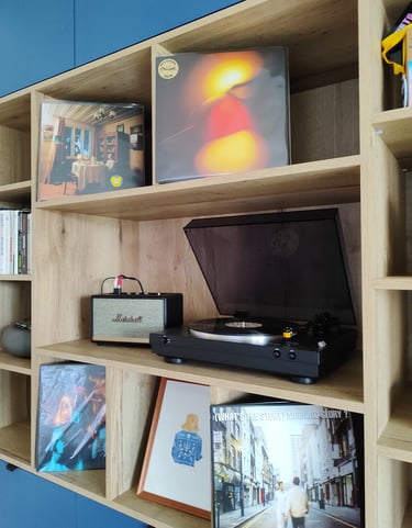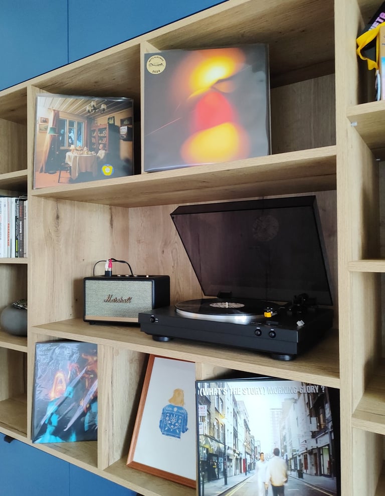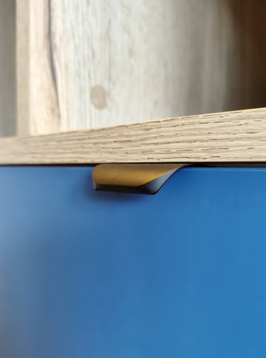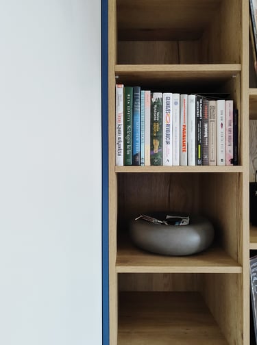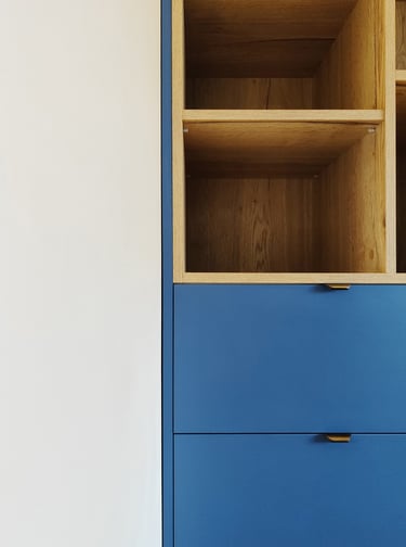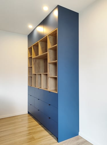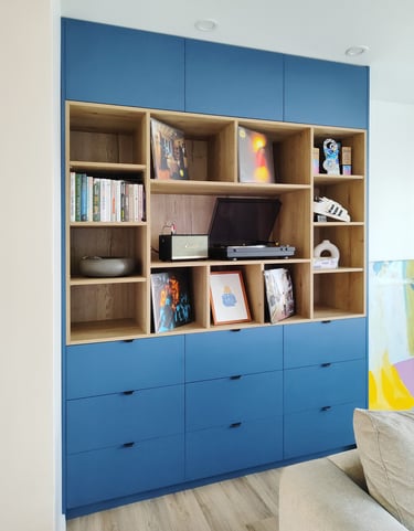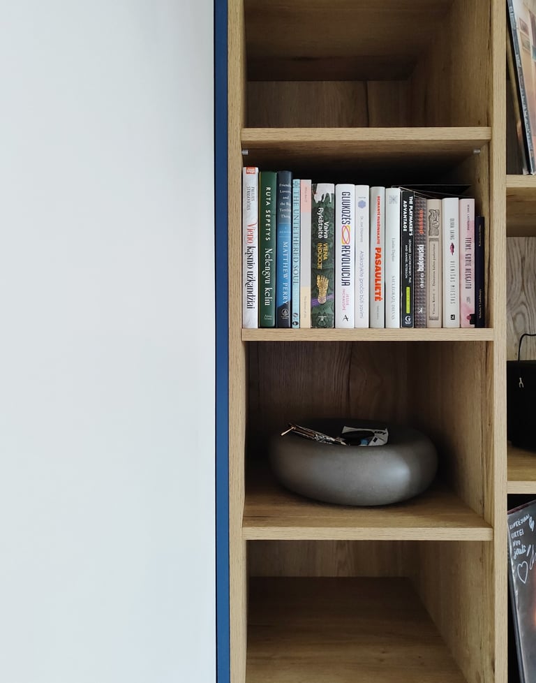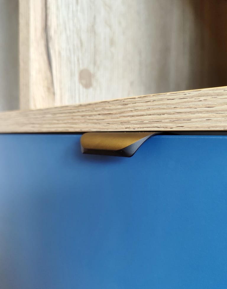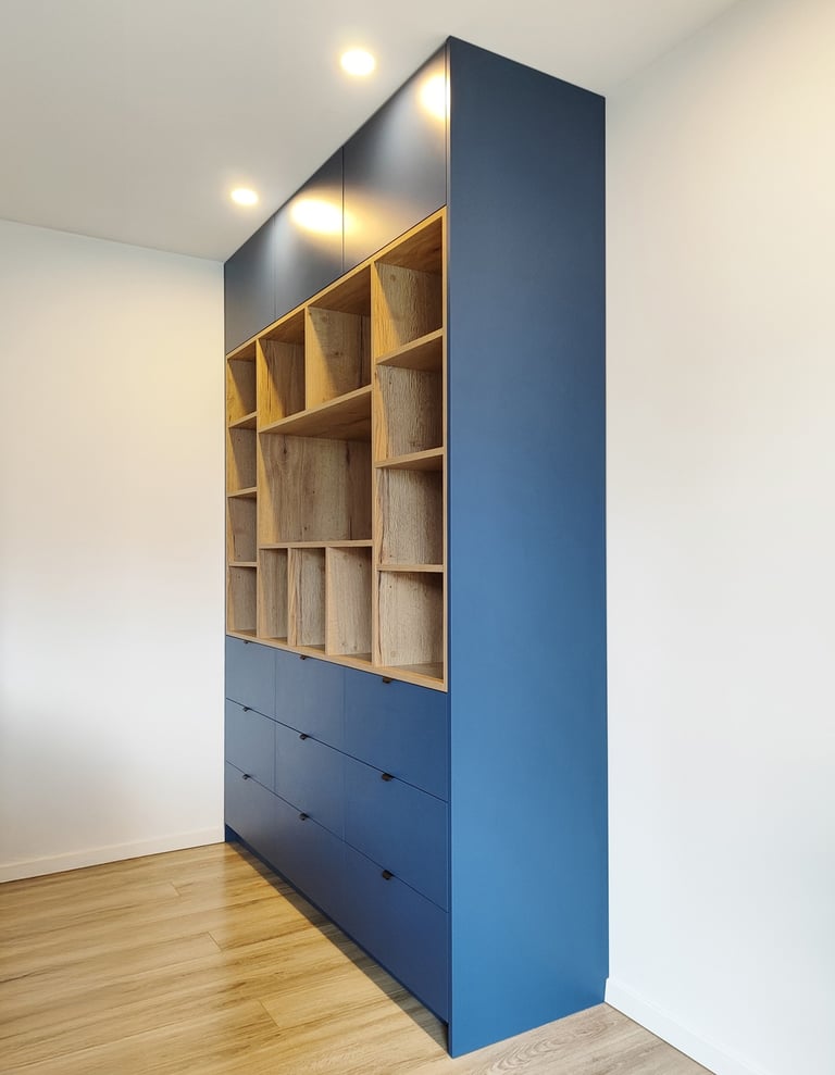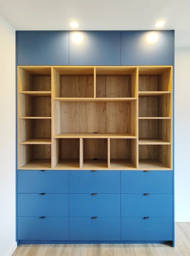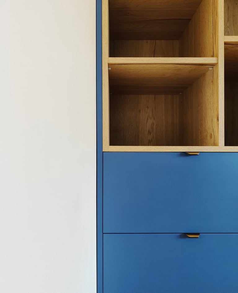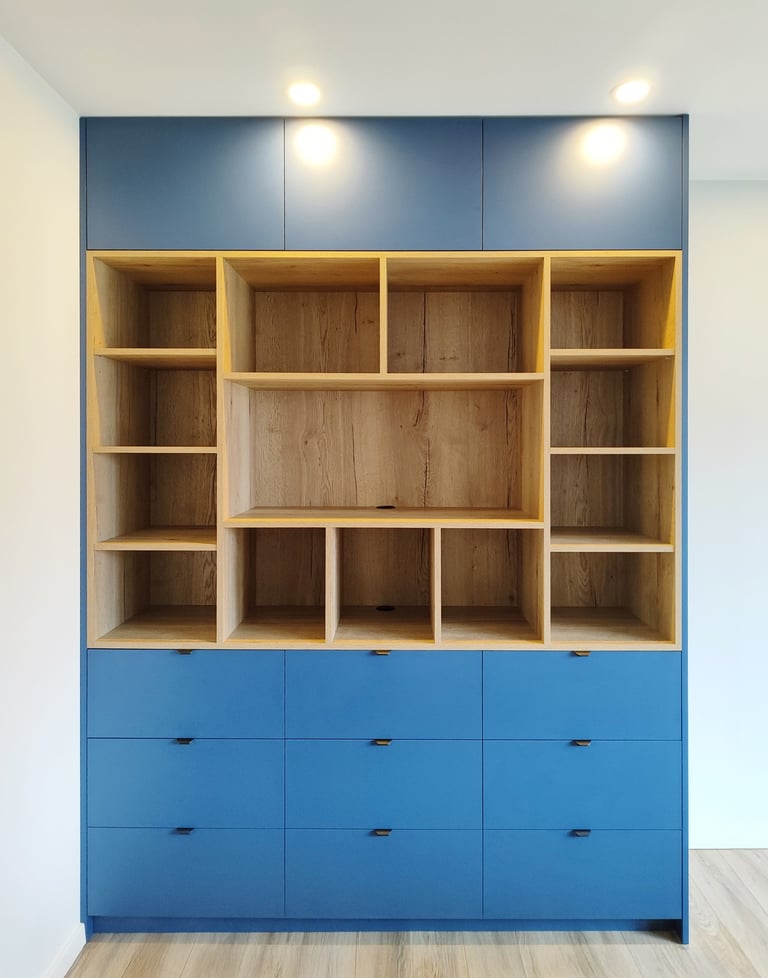 Moderni sieninė spinta su natūralaus ąžuolo ir matinės mėlynos spalvos deriniu. Viršutinėje dalyje – uždari skyriai su paslėptomis rankenėlėmis, viduryje – atviros lentynos, idealiai tinkančios knygoms ar interjero detalėms eksponuoti. Apatinėje dalyje – talpūs stalčiai, užtikrinantys tvarką ir funkcionalumą. Švarių linijų dizainas ir spalvų kontrastas kuria ryškų, bet elegantišką, šiuolaikišką interjero akcentą.