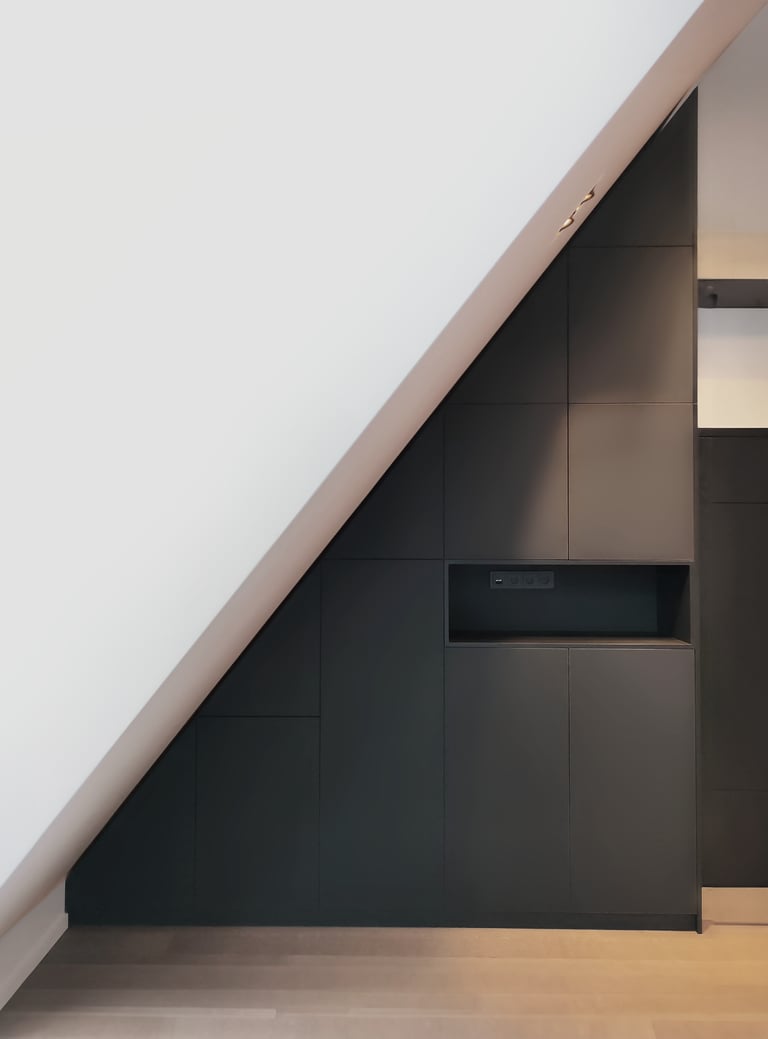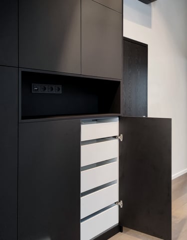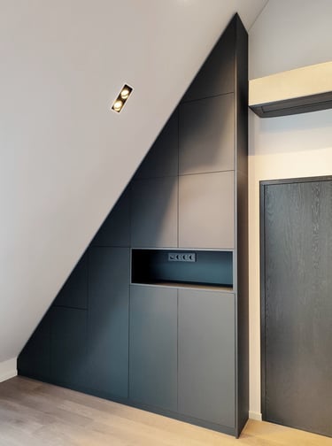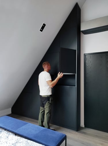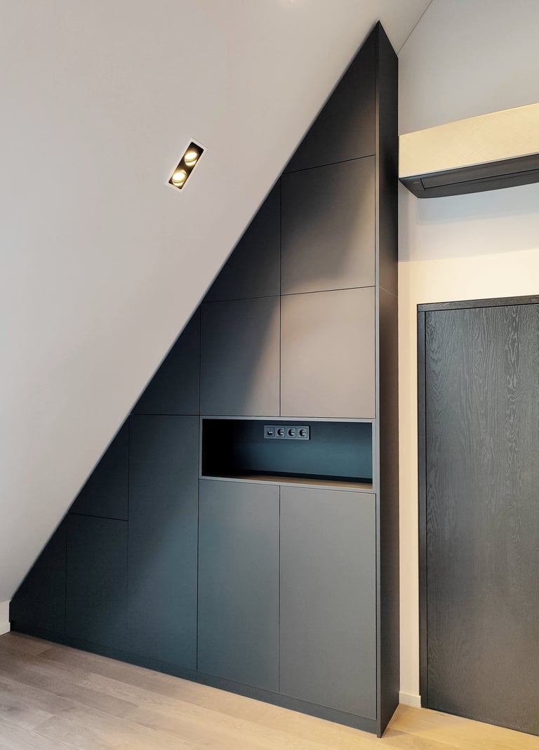 Unikali, išsirtinio dizaino ir formos miegamojo spinta. Puikiai išnaudojome plotą daiktų laikymui, nes kiekviena spintos dalis tapo spintelėmis. Taip pat buvo integruoti švelnaus uždarymo ir pilno ištraukimo stalčiai.