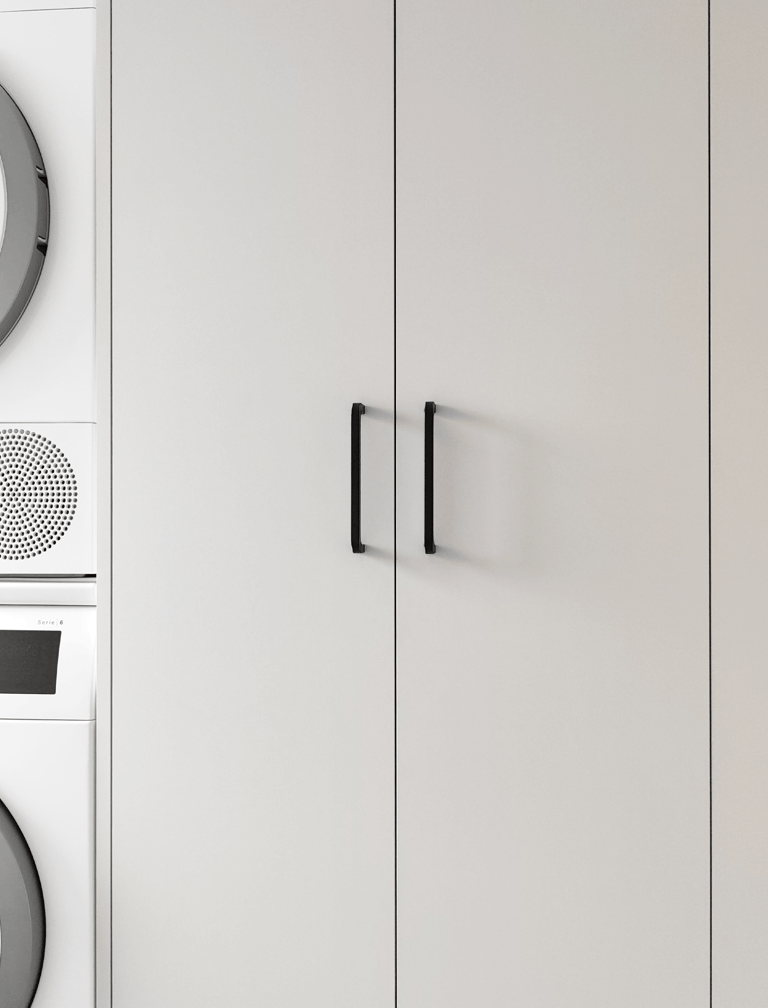 Projektuojant šią ūkinę spintą, turėjome atsižvelgti į visus šios patalpos įrenginius ir norą juos paslėpti. Kruopščiai išmatavę ir apgalvoję, suprojektavome bei pagaminome spintą, kurioje pasislėpė rekuperatorius, dulkių siurblys robotas, paskirstymo skydas, rozetės, o taip pat liko daug vietos patogiam sandėliavimui.
